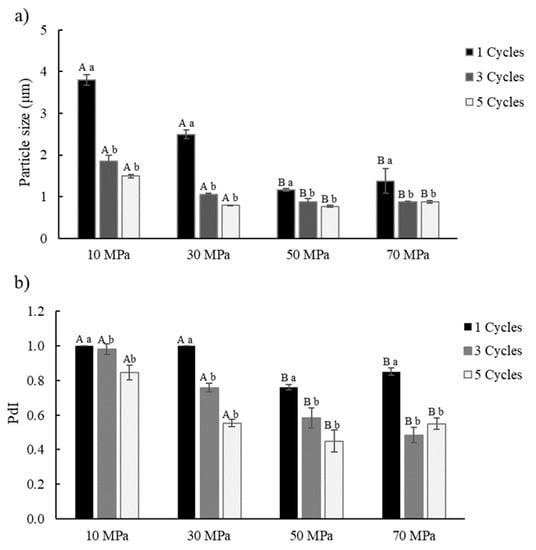 Effect of high-pressure homogenization (from 10 to 70 MPa) and the number of cycles (from 1 to 5) on the (a) particle size and (b) Polydispersity Index (PdI) of the primary emulsion. Different capital letters imply significant differences (p < 0.05) between homogenization pressures. Different lowercase letters show relevant differences (p < 0.05) between homogenization cycles.