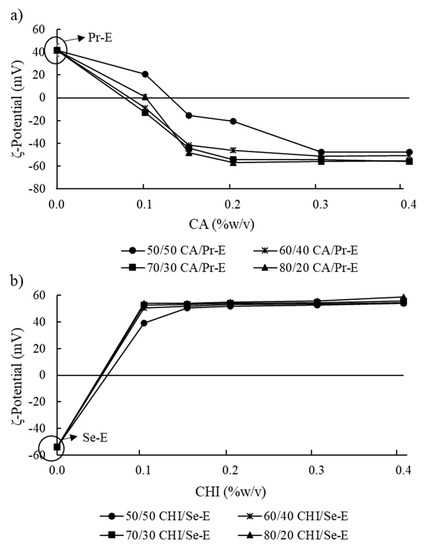 The addition of CA on Pr-E (CA/Pr-E) and CHI on Se-E (CHI/Se-E) needed in different ratios to fully coat the oil droplets of the emulsion was assessed (Figure 3). More specifically, the concentration at which the oil droplets of the emulsion are enveloped by the polyelectrolytes was measured [8].