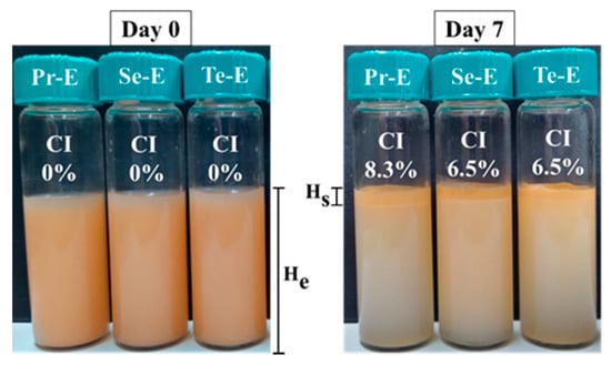 The physical stability of Pr-E, Se-E, and Te-E was examined based on the CI during storage for 7 days (Figure 4).