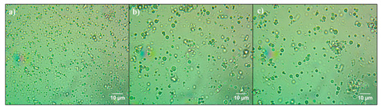 In Figure 5a, it is shown that the droplet size of Pr-E was smaller than emulsions stabilized with two and three interfacial layers (droplet size mean value of Pr-E was 0.87 ± 0.07 µm). In addition, there are drops homogeneously distributed with very few aggregations between them, which indicates adequate physical stability of Pr-E. This could be ascribed to the high concentration of small-sized droplets in the Pr-E because of the high-pressure homogenization process and the presence of LPI as an emulsifier causing high electrostatic repulsion between the emulsion droplets. High electrostatic repulsion between LPI-stabilized oil droplets decreases the aggregations between them, thereby increasing the physical stability of the emulsion [24]. Furthermore, Figure 5b,c shows the droplets of the Se-E and Te-E, in which there is a slight increment in the size of particles and a wall thickness of the microcapsules compared to Pr-E given the presence of a second and third interfacial layer over the droplets of the emulsions with particle sizes of 7.22 ± 0.71 µm and 8.22 ± 2.65 μm (Zetasizer results), respectively. Similar behavior was observed by Burgos-Díaz et al. [14] in multilayer o/w emulsions since as the number of layers in the emulsion increased, the particle size also slightly increased. Emulsions that have small droplet sizes tend to be more stable during the spray-drying process, which is fundamental to achieve high retention of astaxanthin [35].
