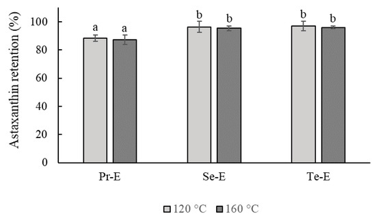 Effect of the inlet temperature of the dried air on the retention of astaxanthin of Pr-E, Se-E, and Te-E during the spray-drying process. Different letters represent significant differences (p < 0.05) in the retention of astaxanthin.