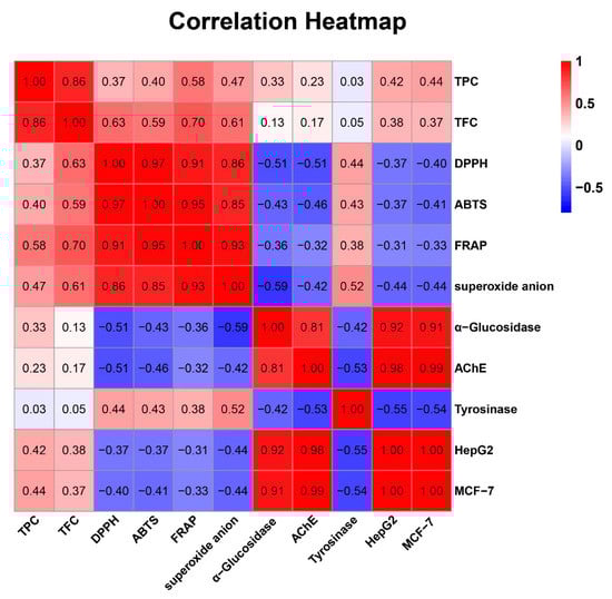 Results showed that the EtOAc fraction possessed higher total phenolic content and the highest total flavonoid content. It also showed the strongest DPPH radical, ABTS radical, superoxide anion scavenging activity, and ferric reducing antioxidant power, even stronger than Vc and BHT. The α-glucosidase inhibition potency of each fraction was evaluated, and the EtOAc fraction displayed the most potent α-glucosidase inhibitory activity twice higher than acarbose, and the same trend was reflected in the AChE inhibition experiment. Additionally, the EtOAc fraction has the highest inhibitory effect on MCF-7 and HepG2 cell proliferation. Considering that there was a strong correlation with each other between these in vitro activities and oxidative stress-related diseases, the EtOAc fraction was used for HPLC analysis and the subsequent animal experiment.