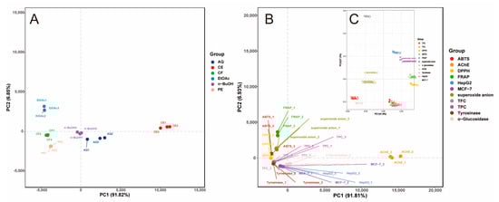 v) was then added and incubated, protected from light, for 30 min at 25 °C. Finally, the absorbance value was measured at 765 nm by a microplate reader (Biotek, VT, USA). Gallic acid (10–100 μg/mL) was used as the standard and results were expressed as μg of gallic acid equivalents (GAE)/mg dry extract (DE).