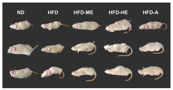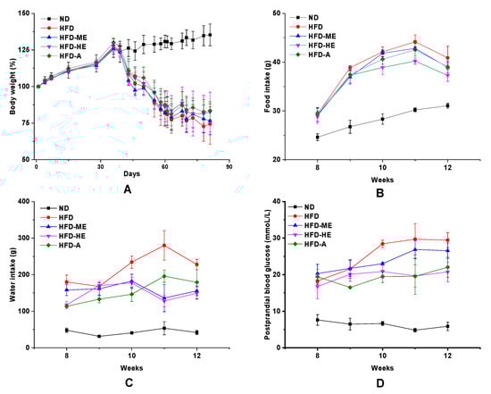 P. frutescens leaf extract fraction with the strongest α-glucosidase inhibitory activity and acarbose were added to feed and mixed thoroughly, and used as the treatment and reference drug respectively. The HFD-ME and HFD-HE groups were fed with the mixed diet with the extract fractions dose of 100 and 250 mg/kg body weight (BW) per day respectively, whereas the HFD-A group were received acarbose (100 mg/kg BW per day). The HFD and ND group were continued to feed with a high-fat diet and a normal diet, respectively. The administration period was 4 weeks, and BW, food and water intake, and postprandial blood glucose were recorded weekly.