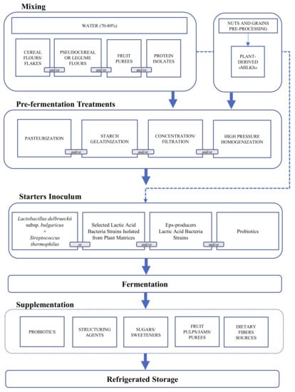 Flow chart of the plant-based yogurt-like production including the biotechnological options proposed by the recent scientific literature.