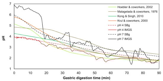 Variation of gastric pH during the in vitro digestion in the IMGS and in a stirred beaker (SBg) of the emulsion gels stabilized by whey protein isolate (WPI), in comparison with the literature data.