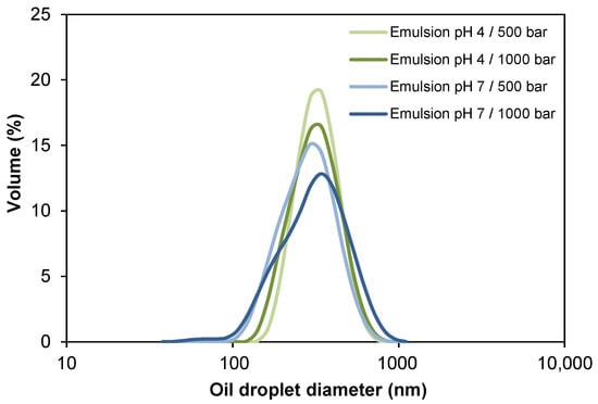 The oil droplet sizes and the size distributions for the four oil-in-water (O/W) emulsions stabilized by WPI are presented in Table 2 and Figure 2. Both particle size and Pdi of the emulsions were not significantly affected (p > 0.05) by the homogenization pressure, reaching values of 302–328 nm and ~0.19 for emulsions at pH 4.0, and ~275 nm and 0.10–0.17 for emulsions at pH 7.0, respectively. The decrease in oil droplet diameter by increasing the homogenization pressure (500 bar vs. 1000 bar) was only observed in pH 4.0 emulsions (328 nm vs. 302 nm, respectively), whereas in emulsions at pH 7.0, the droplet diameter ranged from 260 nm to 271 nm, respectively. The latter can be attributed to the limited amount of surfactant present to stabilize the droplets formed [49]. It is probable that disruptive forces would be able to generate smaller drops at 1000 bar, but even when there is a sufficient amount of surfactant for emulsion formation, it did not adsorb quickly enough during homogenization. Under turbulent flow conditions, as expected in high-pressure homogenization, newly formed droplets collide, which may lead to rapid recoalescence depending on the extent to which droplets are readily covered by emulsifier molecules [50]. Very short timescales are involved in droplet coverage, and whey proteins were presumably unable to completely stabilize small droplets at 1000 bar.