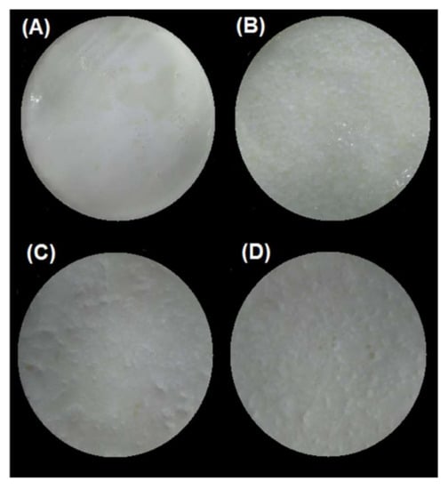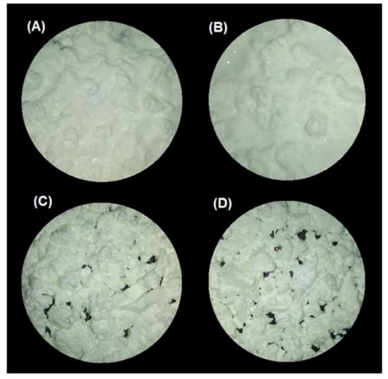 Images of the bolus obtained after oral digestion of the different emulsion gels stabilized by WPI. (A) pH 4/500 bar, (B) pH 4/1000 bar, (C) pH 7/500 bar, and (D) pH 7/1000 bar.