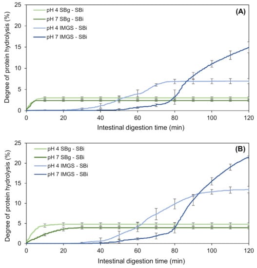 When analyzing the IMGS–SBi, a lag phase for all samples was observed, with times of 25 and 40 min for gels at pH 4.0 and 7.0, respectively. As in the gastric digestion, the gels at pH 7.0 have a higher time of disintegration induced by peristaltic forces, so the amount of protein that passes into the intestinal digestion at the beginning of gastric emptying is lower and, therefore, the time at which the proteolysis begins is later than in samples at pH 4.0.