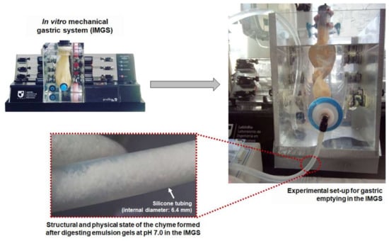 IMGS. The bolus was deposited in the simulated stomach of the IMGS, and the SGF was added at a rate of 3.33 mL/min by pumping (SurefusionTM, Nipro, Osaka, Japan). The rate of flow of gastric juice was representative of that found in in vivo studies [9,34,36]. Simultaneously, the IMGS operation started, exerting the peristalsis in the stomach at a frequency of 3 cycles/min, physiological value of the human stomach [37,38]. For simulation of the gastric pH curve, the same method used for SBg was applied (Figure 1). After the first 15 min, the gastric emptying valve placed at the pyloric section of the simulated stomach was opened. The gastric emptying was performed intermittently every 10 min using a peristaltic pump (Fisherbrand™ 13-876-2, Fisher Scientific, Suwanee, GA, USA), until completing the whole digestion period (120 min), following the phenomenology reported by in vivo studies [12]. The gastric chyme was transferred at a rate of 10 mL/min to the intestinal phase [36,39], with previous adjustment of pH to 7.0. At the pyloric zone, a membrane (pore size: 2 mm) was incorporated to control the particle size of the chyme passing to intestinal digestion [5]. During IMGS digestion, the overall mechanical force exerted on the emulsion gels samples at pH 4.0 and 7.0 was measured as reported previously [13], obtaining values between the ranges of 0.2–1.2 N and 0.2–1.5 N, respectively. These results are in line with those found in an adult human stomach [37,40].