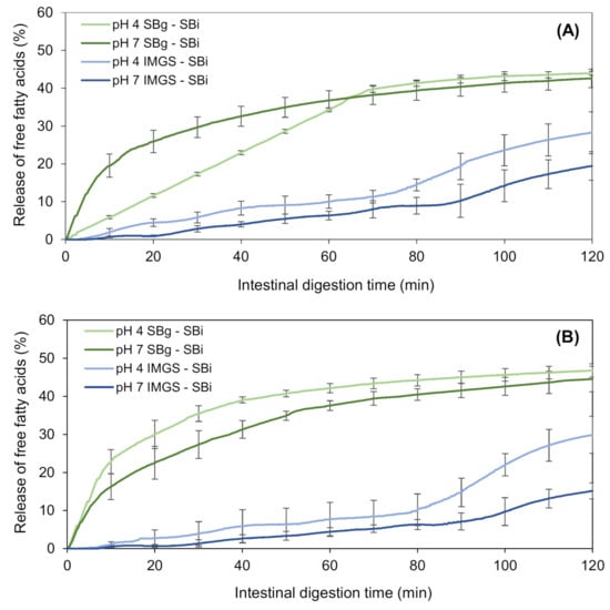 In the case of the kinetics obtained in the IMGS–SBi, it is observed that the four samples under study followed a similar trend during intestinal digestion, presenting a lag phase until approximately 5 min. This is because when gastric emptying in the IMGS begins, the chyme transported to SBi is a liquid with little substrate. Given that during the first minutes the gel disintegration is slow, the available amount of lipids for intestinal hydrolysis is consequently low, resulting in the presence of this lag phase. The digestion trends for these samples did not show significant differences (p > 0.05) until the 80 min of digestion, at which time those samples of pH 4.0 began to increase their rate of digestion with respect to the samples of pH 7.0.