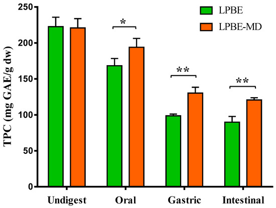 Total phenolic content (TPC, mg GAE/g dw) and bioaccessibility (%) of non-encapsulated (LPBE) and encapsulated (LPBE-MD) PBE before and after gastrointestinal digestion. Values are expressed as mean ± SD of three experiments. * p < 0.05, ** p < 0.01.