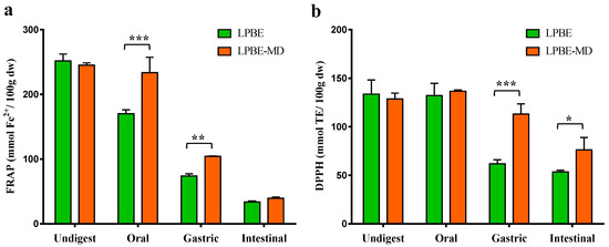 Antioxidant activity by FRAP (a) and DPPH (b) of non-encapsulated (LPBE) and encapsulated (LPBE-MD) PBE before and after gastrointestinal digestion. Values are expressed as mean ± SD of three experiments. * p < 0.05, ** p < 0.01, *** p < 0.001.