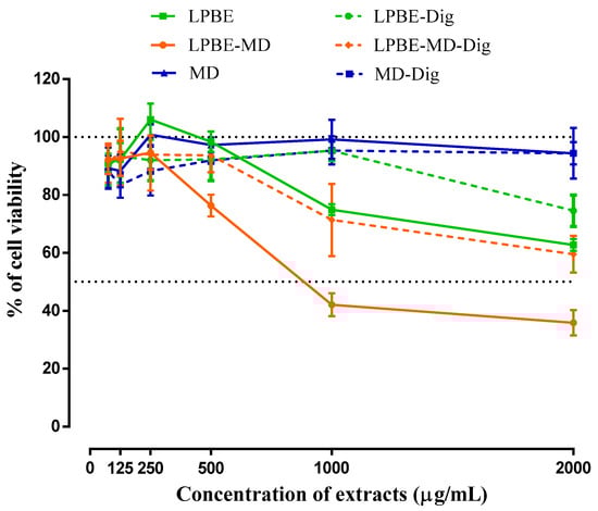 Our data shows that MD as wall material was not toxic toward Caco-2 cells, regardless of the concentration tested. On the other hand, the cells exposed with the LPBE non-encapsulated and/or encapsulated with MD, at concentrations higher than 500 µg/mL, show a significant reduction of cell viability in Caco-2 cells. In addition, when the PBE is encapsulated and the cells are exposed to the same concentration, the number of viable cells suffered a greater reduction of viability, compared to the non-encapsulated extract (LPBE).