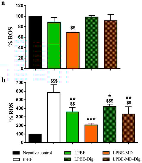 As previously evaluated by the in vitro antioxidant methods to evaluate iron reduction (FRAP) and scavenger activity (DPPH), it is clear that the digestion process influences the AA of PBE and the maltodextrin encapsulation process partially promotes the stabilization of bioactive phenolic compounds, preventing their degradation. This decrease in the antioxidant activity of the extract after digestion is considered normal, due to the degradation or (bio)tranformation of the phenolic compounds present in the bioactive extract. These data corroborate the results obtained by the intracellular ROS assay in Caco-2 cells in which the digested extracts had less preventive effect of ROS generation than the undigested extracts, despite the cells treated with the encapsulated extracts (LPBE-MD-Dig) show a lesser increase in intracellular ROS caused by tbHP.