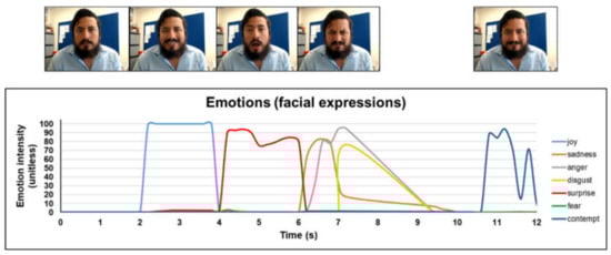 Different emotions: sadness, happy (joy), surprise, disgust, anger, fear, and contempt elicited by a participant. This figure shows 12 s of recording as a demonstration of the different faces’ movements and their relationship with emotions. Actual facial expressions were taken during three seconds after swallowing the sample.