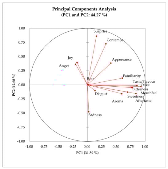 The Pearson correlation coefficient matrix (Table 6) shows the correlations between various variables (sensory attributes, overall liking, familiarity and AFER) for energy drinks A and B. Familiarity was positively correlated with overall liking (r = 0.44) and various sensory attributes such as the liking of taste/flavour (r = 0.40), sweetness (r = 0.38), bitterness (r = 0.44), mouthfeel (r = 0.40) and aftertaste (r = 0.46). The appearance of the product was negatively correlated to the facial expression of “sadness” (r = −0.33). The facial expression “anger” was negatively correlated with the liking of sensory attributes such as sweetness (r = −0.38) and aftertaste (r = −0.29). The results of the principal components analysis (PCA), which explains the relationship between emotions and hedonic attributes are shown in Figure 2. The principal component one (PC1) explained 31.59% of total inertia, while principal component two (PC2) explained 12.68%, respectively. The overall liking vector was positively related to familiarity, sensory attributes (taste/flavour, mouthfeel, aroma, sweetness, bitterness and aftertaste) and emotions (“disgust” and “sadness”), and negatively correlated to emotions (“joy” and “anger”).
