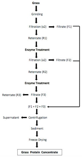 The Trojan cultivar of perennial ryegrass, developed in New Zealand, was used for the experiments. The enzyme used for the extraction was Viscozyme L, a multi-enzyme complex from Aspergillus spp. containing carbohydrases including arabanase, cellulase, β-glucanase, hemicellulase and xylanase (V2010-250mL, Sigma Aldrich, Schnelldorf, Bavaria, Germany) and stored at 5 °C. This enzyme complex is capable of hydrolysing structural cell wall polysaccharides, improving extraction and obtaining protein concentrate [16]. It complies with the recommended purity specifications for food-grade enzymes given by the joint FAO/WHO Expert Committee on Food Additives (JECFA) and the Food Chemical Codex (FCC). All chemicals used in the study were of analytical grade.