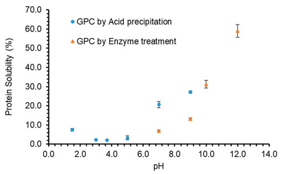 The effects of pH on protein solubility (%) of grass protein concentrate (GPC) extracted through acid precipitation or enzyme treatment. Values are means (n = 3) ± SD.