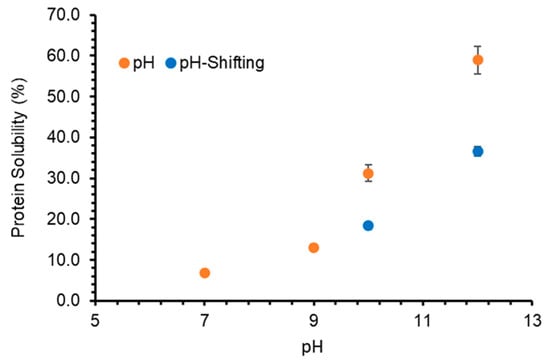 The effects of pH-shift on protein solubility (%) of grass protein concentrate (GPC) extracted through enzyme treatment. Values are means (n = 3) ± SD.