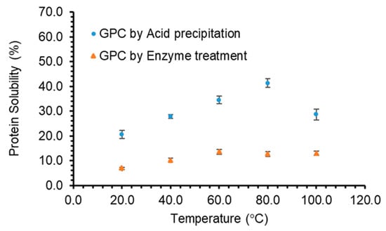 Protein solubility is highly dependent on protein-water interactions, which may be affected by the temperature of the medium the protein is subjected to. When GPC was subjected to a range of temperatures at neutral pH, the solubility increased with increasing the temperature (Figure 5) indicating more protein-water interactions resulting in an increase in the solubility. Protein denaturation during thermal treatment have also been reported to result in weakening of hydrogen bonds and electrostatic forces that hold the protein’s secondary, tertiary or quaternary structure together [23], which could also increase solubility. However, the solubility of GPC obtained by acid precipitation was found to decrease at temperatures higher than 80 °C.