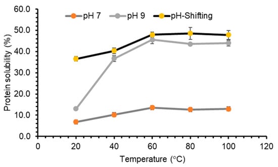Similar results were observed for GPC extracted by enzyme treatment, where the solubility increased with an increase in the temperature up to 60 °C, at pH 7 and 9 (Figure 6). However, when GPC was subjected to temperatures above 60 °C the solubility remained stable, around 13% for pH 7 and 44% for pH 9. Likewise, when the temperature of the GPC sample, obtained by enzyme treatment treated with pH-shifting process of pH 12, was increased from 20 °C to 60 °C, the solubility increased from 36.56% to 48%, and remained stabled above 60 °C (Figure 6). This could be explained by the surface properties of proteins. The amount and distribution of hydrophilic and hydrophobic amino acid moieties on the surface may vary from one protein to another, which can have an impact on the behavior of a protein in solution [23,48].