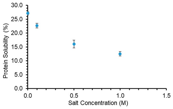 The effects of salt (NaCl) concentration (M) on protein solubility (%) of grass protein concentrate (GPC) extracted through acid precipitation. Values are means (n = 3) ± SD.