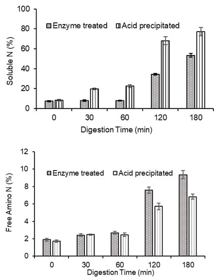 The digests were centrifuged at 17,000× g for 10 min at 4 °C using a high-speed centrifuge (CR 22 GII, Himac, Hitachi Koki Co., Ltd., Ibaraki, Japan). The supernatant was then filtered through a 0.45 µm PVDF filter. The supernatants were analysed for soluble protein (%) and free amino nitrogen using the Kjeldahl method (as described in Section 2.4) and a colorimetric method to determine the ninhydrin-reactive amino nitrogen content, as described by Moore [27] and Kaur, et al. [28], respectively.