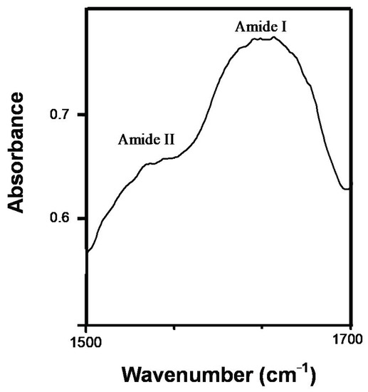 The typical protein bands in the mid-infrared (IR) spectra are amide I (1700–1600 cm−1), amide II (1560–1510 cm−1) (Figure 2) and amide III (1300–1200 cm−1) which provide information on protein secondary structure (α-helix, β-sheet, turn, unordered). Modifications in the intensity and/or frequency of these infrared bands is indicative of protein structural modifications [29,30]. The amide I band, high intensity (Figure 2) due to carbonyl stretching vibration with a slight influence from C-N stretching and N-H bending vibrations, is the one most frequently employed to analyze the secondary structure of proteins. Proteins with α-helical conformation show robust amide I bands between 1657 and 1650 cm−1, whereas bands between 1640 and 1612 cm−1 are usually related with β-sheets.