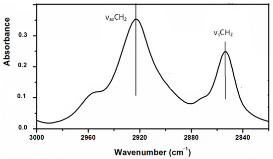 The mid-IR spectra of lipids encompass various bands in the 3000–1700 cm−1 region and overlapping bands in the 1500–700 cm−1 region. It is worth noting that in the elaboration of meat products with health-enhanced lipid content, infrared studies of the region between 3000–2800 cm−1 are characterized by two strong bands at 2925 and 2854 cm−1 (Figure 3) caused respectively from the asymmetric (νasCH2) and symmetric (νsCH2) stretching vibrations of the acyl CH2 groups of lipids [31,32,33]. Modifications in lipid chain order/disorder causing from protein–lipid interactions can alter the half-bandwidth of these bands [34].