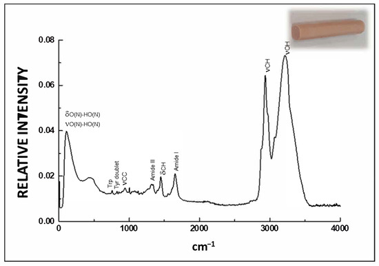 Raman spectra also show a broad water band (3100 and 3500 cm−1) (Figure 4), associated with OH stretching motions [38,39], and a Raman band in the low-frequency range (below 600 cm−1) including the bending (δ) and stretching (ν) vibrations of the O(N)-H..O(N) units, due to interactions of hydrogen bonded to water and protein molecules [38,39].