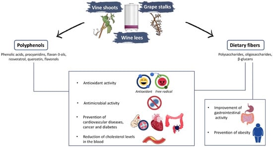 Vine shoots, grape stalks, and wine lees, although produced in smaller quantities than grape pomace, represent a rich source of functional compounds. In this framework, the purpose of this review is therefore to highlight the potential use of these wastes and by-products in the food sector as (i) antimicrobial and antioxidant agents; ii) natural additives; (iii) nutritional and food quality improver; and (iv) filler in food packaging formulations.