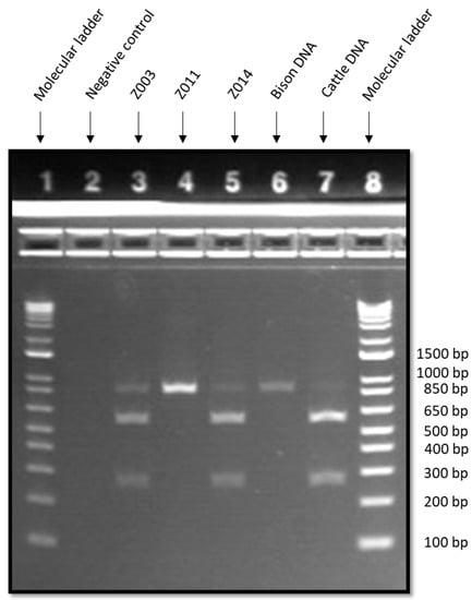 The three samples that tested positive for domestic cattle with DNA barcoding were subjected to confirmatory testing with PCR-SFLP using the satellite 1.711b genetic marker combined with TaqI restriction enzyme (Figure 1). The expected result for bison was a single band at 822 bp, while the expected result for domestic cattle was three bands at 250 bp, 552 bp, and 809 bp []. As shown in Table 3, the results for sample Z011 and the positive bison DNA control were consistent with the expected result for bison. On the other hand, the results for samples Z003, Z014, and the positive cattle DNA control were all consistent with the expected result for domestic cattle. Overall, the combined results of DNA barcoding and PCR-SFLP indicated that among the three samples that tested positive for domestic cattle with DNA barcoding, two were domestic cattle (Z003 and Z014) and one sample was American bison with ancestral cattle DNA (Z011).