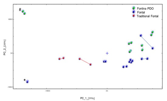 Plot of principal component (PC) analysis of commercial cheese samples. Duplicate samples are connected for clarity in identification. (#) Long ripened Fontina PDO cheese; (*) Fontal cheese produced in a mountain area.