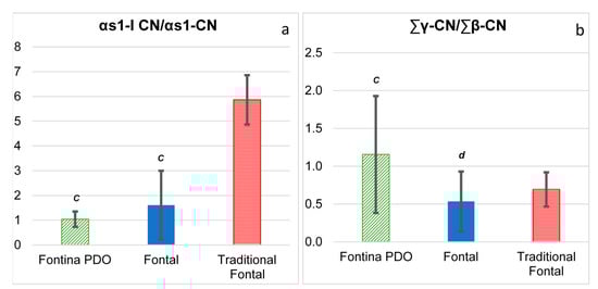 Initial breakdown of casein in cheese is due to the combined action of coagulant and plasmin. Capillary electrophoresis proved to be an analytical tool capable of high resolution and low-cost analysis of proteins and large peptides and can be successfully adopted to evaluate the extent of primary proteolysis in different types of cheese [14,27,28]. With this aim, the ratio between a casein fragment and the intact parent casein fraction were assumed as indicators of specific proteolytic activities. In particular, chymosin activity was evaluated through the peak area ratio αs1-I-CN/αs1-CN, whereas plasmin activity was evaluated through the peak area ratio γ-CN/β-CN [14]. The ratio αs1-I-CN/αs1-CN was not statistically different between Fontina and Fontal and the values of the latter cheese type fluctuated remarkably, with the highest values reached in traditional Fontal cheese samples (Figure 2a). Accumulation of the αs1-I-CN fragment (f24-199) begins within a few hours after milk coagulation, as a result of the activity of chymosin retained in the curd, and it is largely accepted that chymosin retention mostly depends on the temperature of curd cooking and pH at draining [29]. According to the product specification of Fontina PDO, curd cooking temperature should be within 46 and 48 °C, a rather narrow range, whereas no restrictions are provided for Fontal cheese. Previous papers report that high cooking temperatures lead to an increased inactivation of chymosin and thus to a decreased rate of αs1-casein degradation during cheese ripening [27,30]. Furthermore, the type of coagulant used in cheese making could have had a role. In fact, like most PDO cheeses, Fontina is typically obtained with calf rennet, whereas generic cheeses are nowadays usually obtained with the less expensive microbial or genetic coagulants that have different heat and pH stabilities [31]. Thus, differences in both the cooking temperature and the type of coagulant might account for the high variability of the ratio αs1-I-CN/αs1-CN observed in this study among Fontal cheese samples.