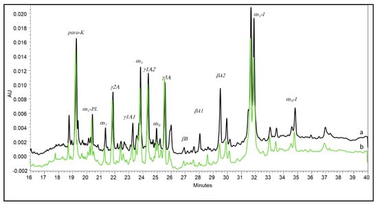 Capillary electrophoresis of Fontina PDO cheeses manufactured in a steel vat (a) and in a copper vat (b) respectively.