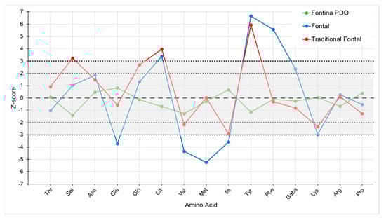 All commercial samples of Fontina PDO cheese evaluated according to the proposed model were correctly identified, since in none of the samples more than two FAAs presented a Z-score exceeding the value of ±2.0, and in no case the value of ±3.0 was reached. On the contrary, all Fontal cheeses presented two or more FAAs with Z-scores exceeding the value of ±3.0 and even values over 5.0 were observed (Table S2). Hence, it appears possible to distinguish these two cheese types on the basis of their FAA profile. The two samples of traditional Fontal were clearly distinguished from Fontina as well. A graphical representation of this type of evaluation is shown in Figure 4.