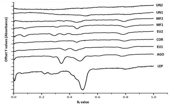 It also appears that there might be common antioxidant constituents present across different honey organic extracts illustrated, for example, by common bands at Rf 0.806–0.809 for COR and MF2, whereas the presence of other antioxidant constituents seems to be more tied to particular honeys. This can be seen, for instance, for the band at Rf 0.476 in LEP, which notably contributes to the extract’s antioxidant activity, but does not seem to occur across most of the other honeys analysed in this study.