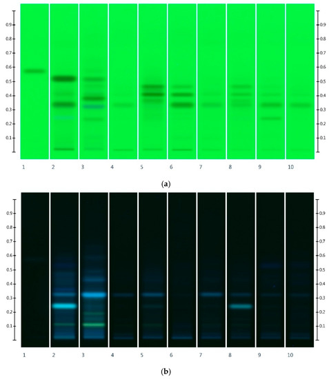Honey extracts’ floral fingerprints. (a) Images taken at R 254 after development, (b) R 366 after development, (c) white light after derivatisation with vanillin reagent, and (d) R 366 after derivatisation with vanillin reagent; Track 1—4,5,7-trihydroxyflavanon, Track 2—LEP, Track 3—AGO, Track 4—EU1, Track 5—COR, and Track 6—EU2, Track 7—MF1, Track 8—MF2, Track 9—UN1, and Track 10—UN2; 5 µL of each honey extract.