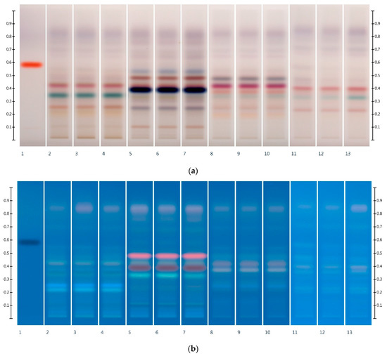Floral fingerprints after thermal exposure: Images taken at (a) white light after derivatisation with vanillin reagent, and (b) R 366 after derivatisation with vanillin reagent; Track 1—4,5,7-trihydroxyflavanon, Track 2—LEP, Track 3—LEP at 40 °C after 48 h, Track 4—LEP at 60 °C after 48 h, Track 5—AGO, Track 6—AGO at 40 °C after 48 h, Track 7—AGO at 60 °C after 48 h, Track 8—MF2, Track 9—MF2 at 40 °C after 48 h, Track 10—MF2 at 60 °C after 48 h, Track 11—UN1, Track 12—UN1 at 40 °C after 48 h, and Track 13—UN1 at 60 °C after 48 h; 5 µL of each honey extract.
