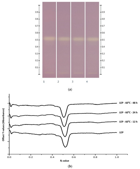 Overall, it appears that honeys with higher antioxidant band activities tend to be more affected by temperature, leading in most instances to a decrease of activity from baseline values, a finding which is also supported by other studies [29,40,41,42,43]. Additionally, as expected, a higher temperature seems to exert a stronger effect, as at 40 °C, most honeys were found to be stable, except LEP when exposed for 48 h. At the higher storage temperature of 60 °C, honeys with higher antioxidant band activities were affected even at shorter exposure times (beyond 12 h). More honeys would need to be examined to confirm the generalisability of these trends; however, this is outside the scope of this study, which does not aim to investigate particular honeys’ antioxidant characteristics, but to demonstrate the usefulness of HPTLC–DPPH fingerprinting for the tracking of antioxidant activity of honeys.