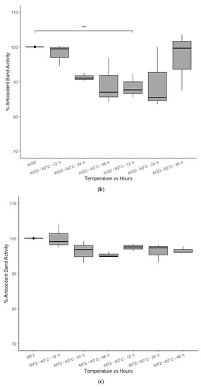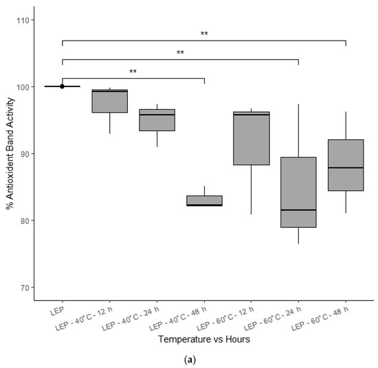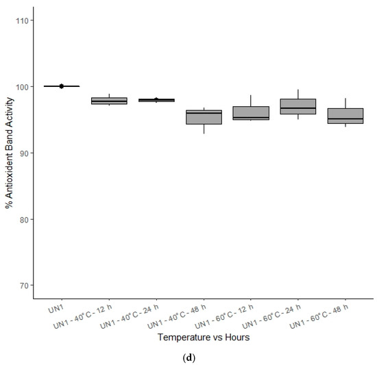 (a–d) Graphical representation of % antioxidant band activity of different honey extracts at different temperature time-points. Significance ** is indicated for p < 0.05.