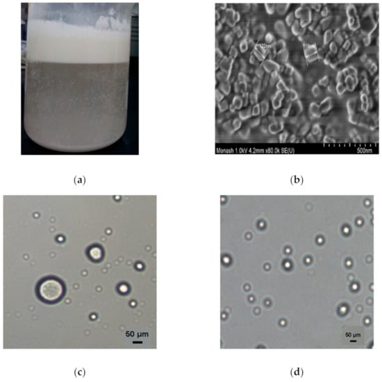 As depicted in Figure 1b, the CaCO3 dispersion containing particles with a homogenous shape and size of approximately 100 nm was successfully prepared through high-pressure homogenization. Because of their hydrophilic nature, the adsorption of these submicron-sized particles on the oil droplets contributed to the formation of O/W emulsions []. The droplets containing emulsified TRF formed the cream emulsified layer on the top (Figure 1a), providing the creaming characteristic normally observed in Pickering emulsions [].