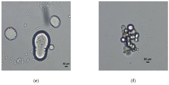 In line with previous studies [,], the volume fraction of the EP increased with elevated CaCO3 level. As expected, an elevation of the CaCO3 particle concentration from 0.5 to 1% (w/v) contributed to an approximately five-fold reduction in the mean droplet size (Table 2). According to the limited coalescence phenomenon theory by Arditty, Whitby, Binks, Schmitt, and Leal-Calderon [], the droplets tend to coalesce until the coverage limit of the droplets is achieved, provided that a limited number of particles are available in the emulsion system. In other words, a higher content of CaCO3 could supply more particles for droplet adsorption, thereby facilitating the full coverage of more tiny droplets. Because of the enhanced coverage of the emulsion droplets, the resulting EPs exhibited improved stability with improved tocotrienols entrapment efficiency (Table 3). In particular, the emulsions of 0.875% and 1% were found to be exceptionally stable with higher CI and the smallest change in droplet size (Table 2). The emulsions of higher CaCO3 content were discovered to demonstrate higher resistance against centrifugation (Figure 2c). However, the elevated CaCO3 level beyond 0.75% (0.875% and 1%) resulted in the sedimentation of the emulsion (Figure 1a), which was most likely caused by an excess of CaCO3 and/or the higher density of droplets. The density of the droplets will increase with higher particle concentration and eventually sink when the droplets become denser than the continuous aqueous phase []. In addition, a further increase in the CaCO3 level may also result in droplet aggregation (Figure 1f) and therefore cause sedimentation of the droplets.