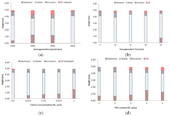 Emulsified phase (EP) height (cm) after centrifugation as affected by (a) homogenization speed (rpm); (b) homogenization time (min); (c) CaCO3 concentration (%, w/v); (d) TRF content (%, w/w).