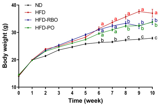 Body weight changes in C57BL/6 male mice who were allowed ad libitum access to the indicated diets as pellets for 10 weeks. Results are reported as means ± SEM. Mean values with different letters are significantly different within the specific week (p < 0.05). (ND, normal diet; HFD, high fat diet; HFD-RBO, high-fat diet-rice bran oil; HFD-PO, high-fat diet-palm oil).