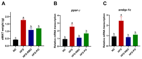 Epididymal white adipose tissue (eWAT) weights and expression of adipogenic genes. (A) Epididymal white adipose tissue was dissected and its weight measured after 10 weeks of dietary intervention. The expression of adipogenic genes, (B) ppar-γ and (C) srebp-1c, was assessed by qRT-PCR. Relative transcription levels of the target gene were calculated by normalization to β-actin using the delta–delta Ct method (2−ΔΔCt). Data are expressed as means ± SEM. Different letters indicate significant differences between groups (p < 0.05) (ND, normal diet; HFD, high fat diet; HFD-RBO, high-fat diet-rice bran oil; HFD-PO, high-fat diet-palm oil).