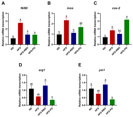 Analyses of mRNA transcription of macrophage polarization in eWAT by qRT-PCR. The mRNA transcription of macrophage marker (A) f4/80, the M1 markers (B) inos and (C) cox-2, and the M2 markers (D) arg1 and (E) ym1 in eWAT. Results were normalized to internal control β-actin gene by using the delta–delta Ct method (2−ΔΔCt). Data are presented as the mean ± SEM, and significant differences are indicated with different letters (p < 0.05). (ND, normal diet; HFD, high fat diet; HFD-RBO, high-fat diet-rice bran oil; HFD-PO, high-fat diet-palm oil).
