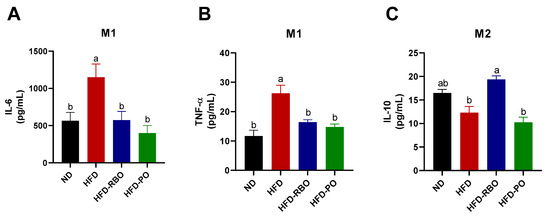 Cytokine expressions in M1- and M2-induced BMDMs. Levels of cytokines in polarized BMDM culture supernatants were determined by ELISA. Secretion of the pro-inflammatory cytokines (A) IL-6 and (B) TNF-α was assessed under LPS/IFN-γ-stimulated M1 conditions. Levels of the anti-inflammatory cytokine (C) IL-10 were quantified in IL-4/IL-13-induced M2 BMDMs. Data are presented as means ± SEM. Significant differences are indicated with different letters (p < 0.05) (ND, normal diet; HFD, high fat diet; HFD-RBO, high-fat diet-rice bran oil; HFD-PO, high-fat diet-palm oil).
