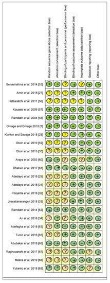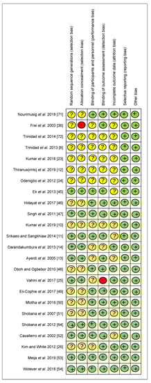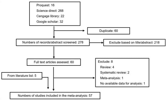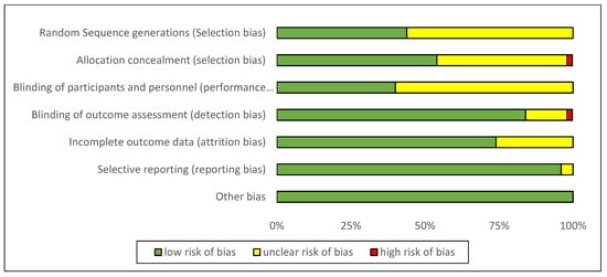 A total of sixty articles (from 338 articles) were selected for full-text review, resulting in fifty-seven articles [,,,,,,,,,,,,,,,,,,,,,,,,,,,,,,,,,,,,,,,,,,,,] that met the inclusion criteria. Eight of them were rejected due to a lack of essential data. Five additional articles [,,,,] from reference lists of identified trials were included in the study because they met the inclusion criteria. In total, the meta-analysis involved fifty-seven articles, as exhibited in Figure 1. According to the Cochrane Collaboration tool, eleven trials [,,,,,,,,,,] were categorized as being at a low risk of bias, while forty-four were categorized as unclear [,,,,,,,,,,,,,,,,,,,,,,,,,,,,,,,,,], and two were categorized as being at a high risk of bias [,]. Details about the risk of bias are supplied in Figure 2 and Figure 3.